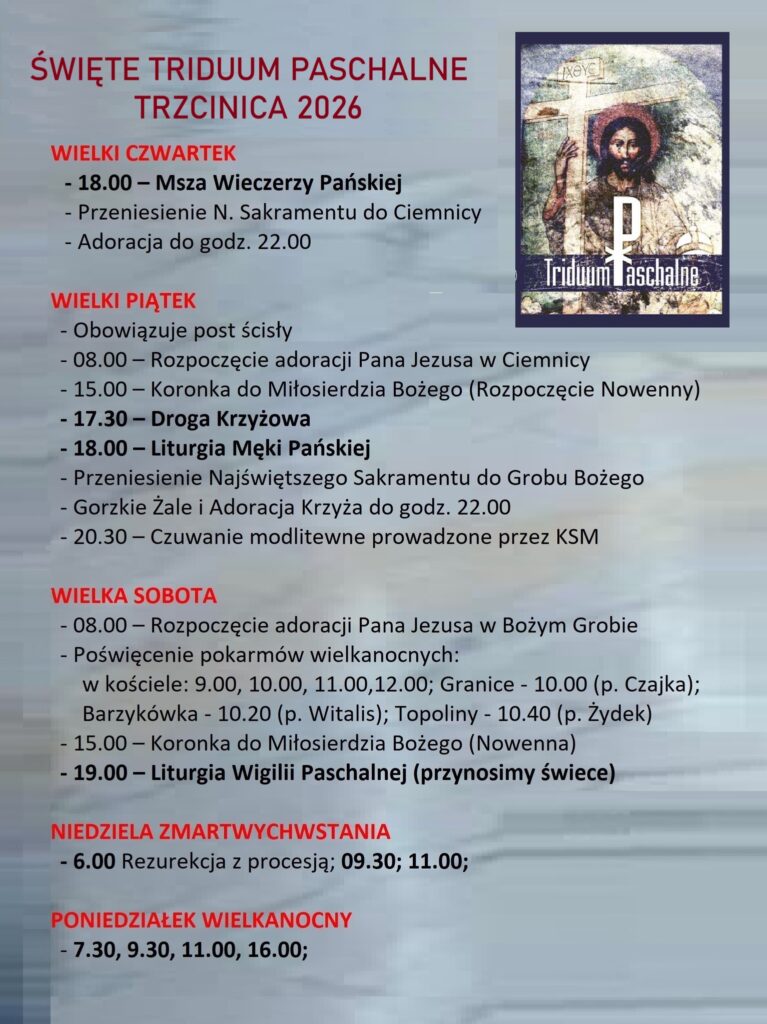 - Zachęcamy parafian z poszczególnych rejonów do godzinnej adoracji Pana Jezusa w Wielki Piątek i Wielką Sobotę. Proponujemy następujący porządek: 8.00 – Wieś; 9.00 – Krzyżówka i koło szkoły; 10.00 – Górki; 11.00 – Łąki; 12.00 – Dąbrowy i Góry; 13.00 – Granice; 14.00 – Zajączkowice i Zagrody; 15.00 – Barzykówka; 16.00 – Przerwa i Topoliny; 17.00 – Przysieki i Tłoki.